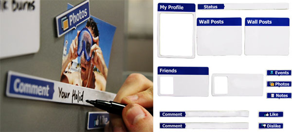 El nombre de estos adorables imanes es Fridgebook, y se trata de imanes que simulan ser los botones de la red social, para que puedas ponerlos en tu nevera y escribir tu estado, agregar una fotografía y realizar comentarios, o destacar a tus “mejores amigos”, todo sin tener que estar necesariamente conectado a tu muro de Facebook convencional.