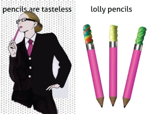 Su nombre es Lolly Péncil y se trata de un simple lápiz de oficina que presenta en vez de goma de borrar, un delicioso caramelo dulce para poder chupar mientras se realzan las tareas cotidianas de oficina o estudio.