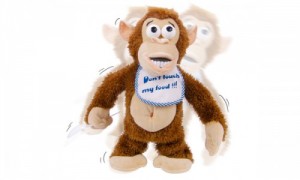 Su nombre es «Mono Loco» (¡tenía que ser!) y viene con un babero de lo mas adorable en el que yace inscripta una advertencia lógica «¡No toques mi comida!».
