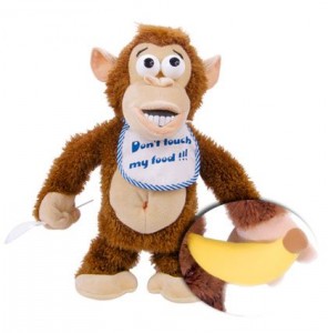 Porque a nadie le gusta que le saquen la comida, y esto es precisamente lo que le molesta tanto a este simpático mono de peluche, que se revolcará de ira si le quitas su golosina más preciada: un plátano que sostiene con fuerza y recelo en sus pequeñas manitos.