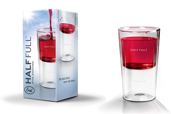 Este vaso de diseño se llama Half Full´(que en Español significarÃa `Medio lleno´ y es un producto de la firma Fred & Friends.