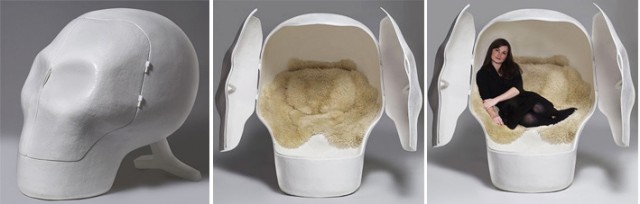Este sillón calavera gigante se llama Wellness Skull y fue creado en el año 2007 por el estudio holandés de Atelier Van Lieshout.