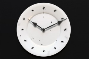 Porque este simpático reloj presenta moscas en vez de números, y esta realizado bajo una base que simula ser un plato de porcelana.